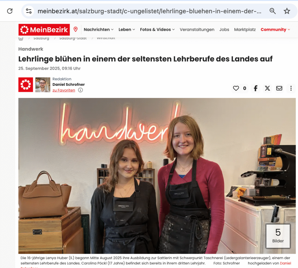 Die 17-jährige Carolina Pöckl und die 16-jährige Lenya Huber entschieden sich für einen der seltensten Lehrberufe Österreichs – die beiden Salzburgerinnen machen die Ausbildung zur Sattlerin mit Schwerpunkt Taschnerei (Ledergalanterieerzeuger) bei Christina Roth, Gründerin der CR Lederwerkstatt in der Getreidegasse in der Stadt Salzburg. Beiden war klar, sie möchten eine Lehre machen, einen handwerklichen Beruf erlernen und in einem kleinen Unternehmen ihre berufliche Karriere starten.