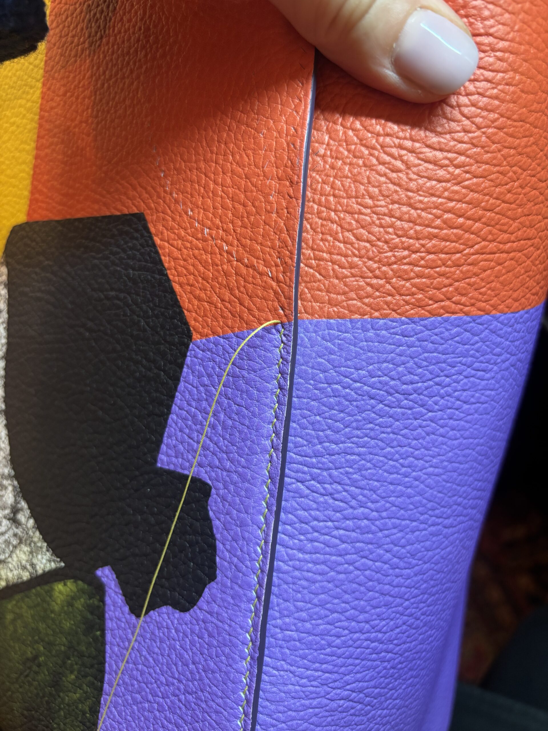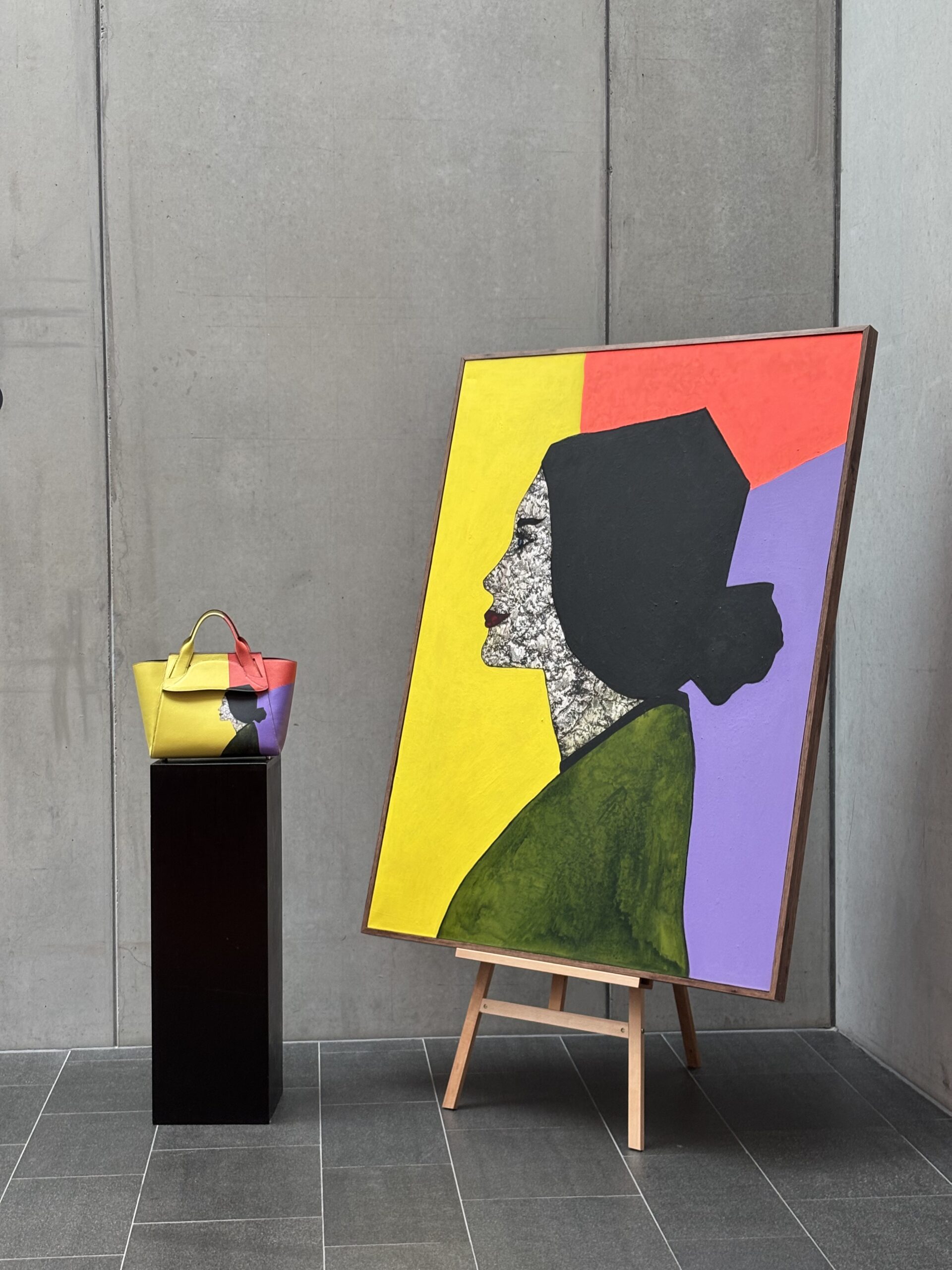 Die technische Übertragung des Kunstwerks auf Leder stellte höchste Anforderungen an Materialverständnis und Präzision. Die Herausforderung: den fließenden Charakter des Originals zu bewahren – auf einem lebendigen Naturmaterial, das sich bewegen darf, ohne an Ausdruck zu verlieren. Basierend auf unserem Modell Ursula, haben wir hier in 70h Handarbeit eine special edition gefertigt, die es nur einmal auf der Welt gibt. Sie kann gemeinsam mit dem Bild erworben werden.